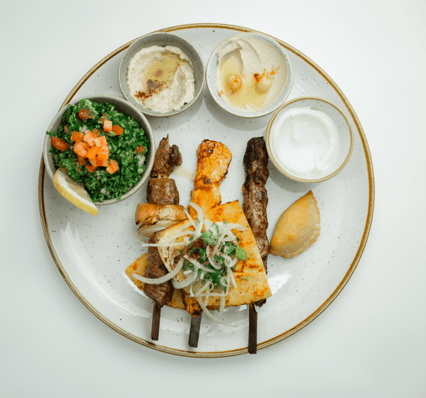 Your choice from the grill served in a mixed plate with tabouli, baba ghanouj, hommus, garlic dip and falafel
