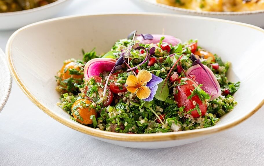 a gluten-free twist on the traditional lebanese tabouli made with parsley, quinoa, tomato, onion and mint, finished with a tangy lemon and olive oil dressing